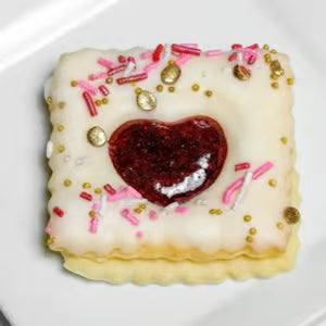 Delicate cookie with white icing, heart-shaped jam center, and sprinkled with pink and gold decorations.
