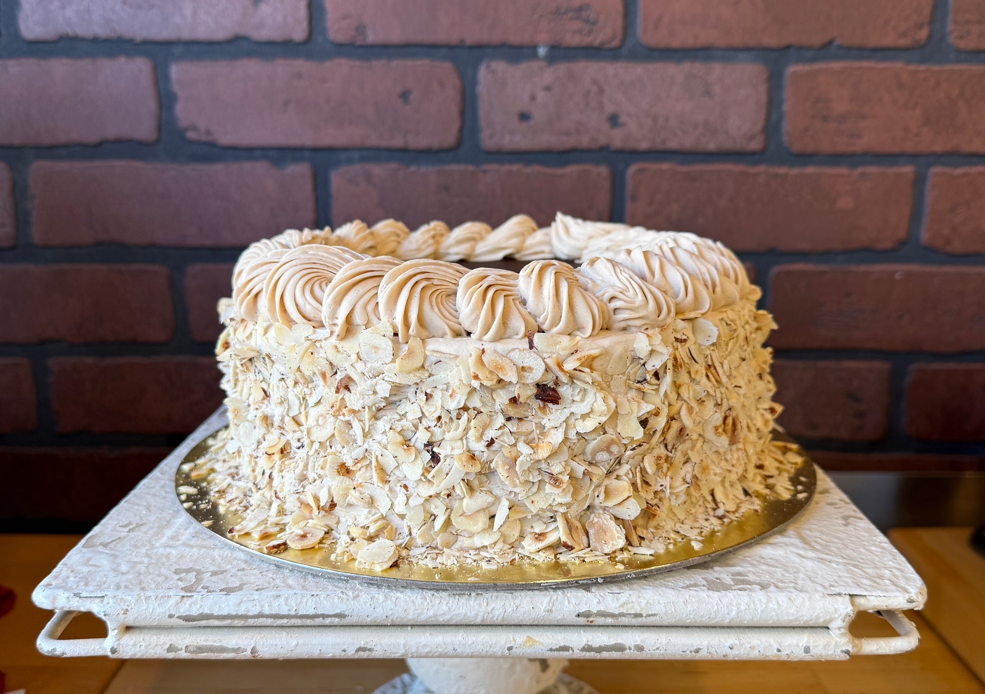 Indulge in Bacio, a playful delight featuring a rich chocolate sponge layered with smooth hazelnut buttercream. Crunchy roasted hazelnuts circle the cake, while a luscious ganache topping adds the perfect finishing touch. Perfect for those who love a nutty, chocolatey treat with a fun twist! Sold Frozen.