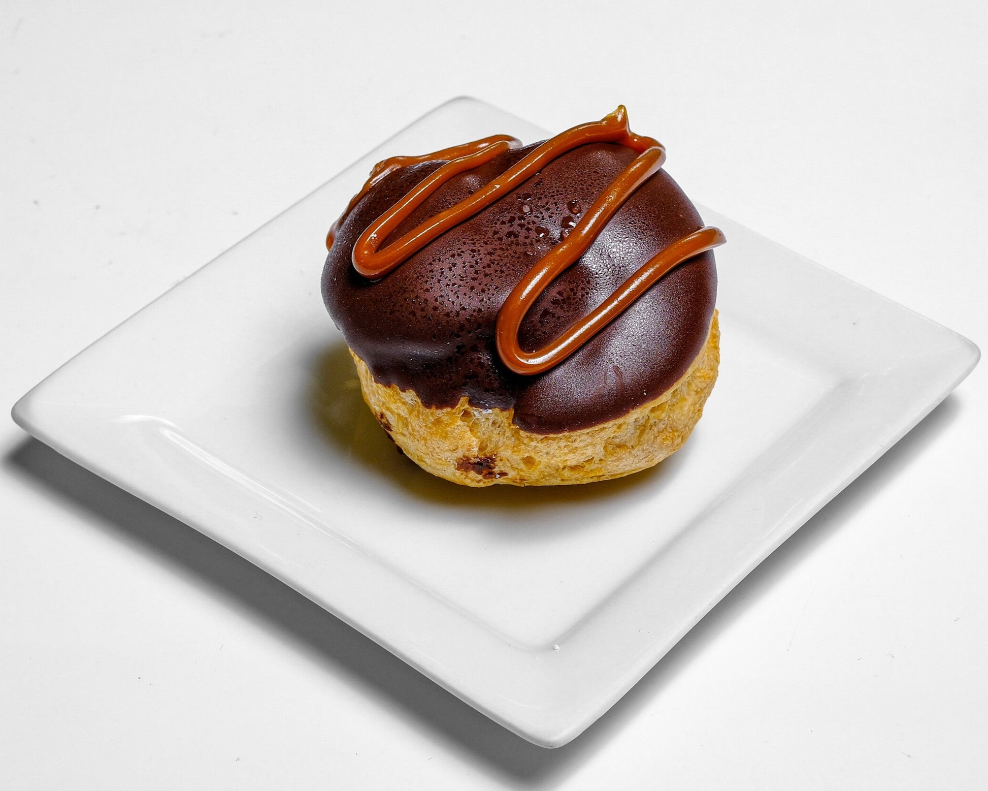 Light choux pastry filled with smooth cream, topped with rich chocolate glaze and drizzled with caramel.