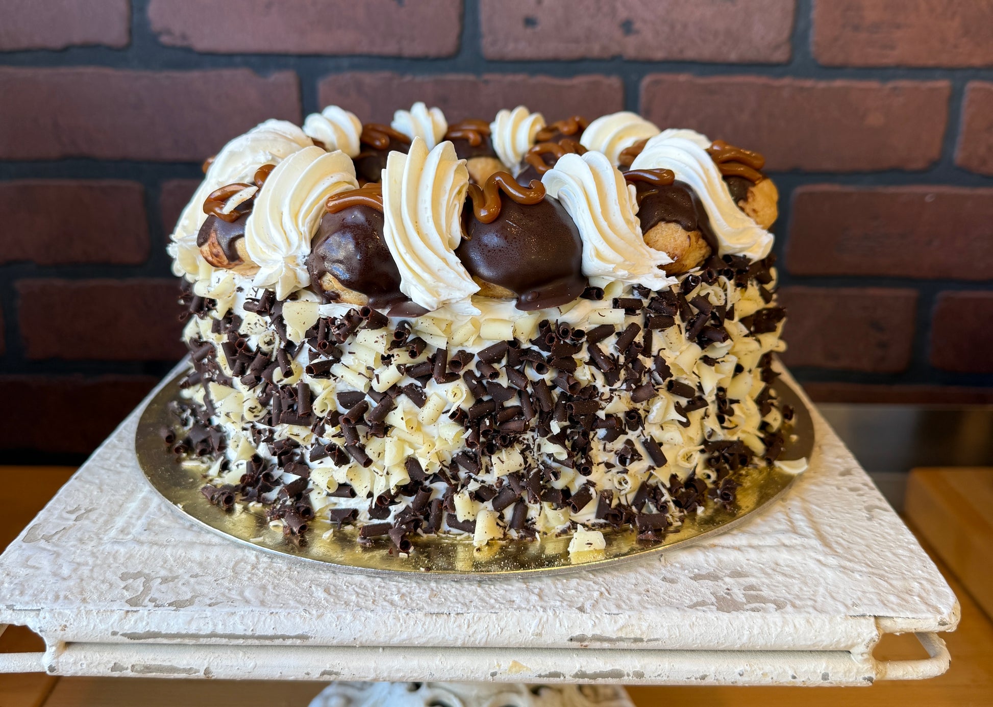 This cake features our handcrafted choux pastry filled with a caramel mascarpone. It has one layer of chocolate sponge and is finished with chocolate shavings, roasted pecans, cream puffs, caramel, ganache, and sea salt. Sold frozen.