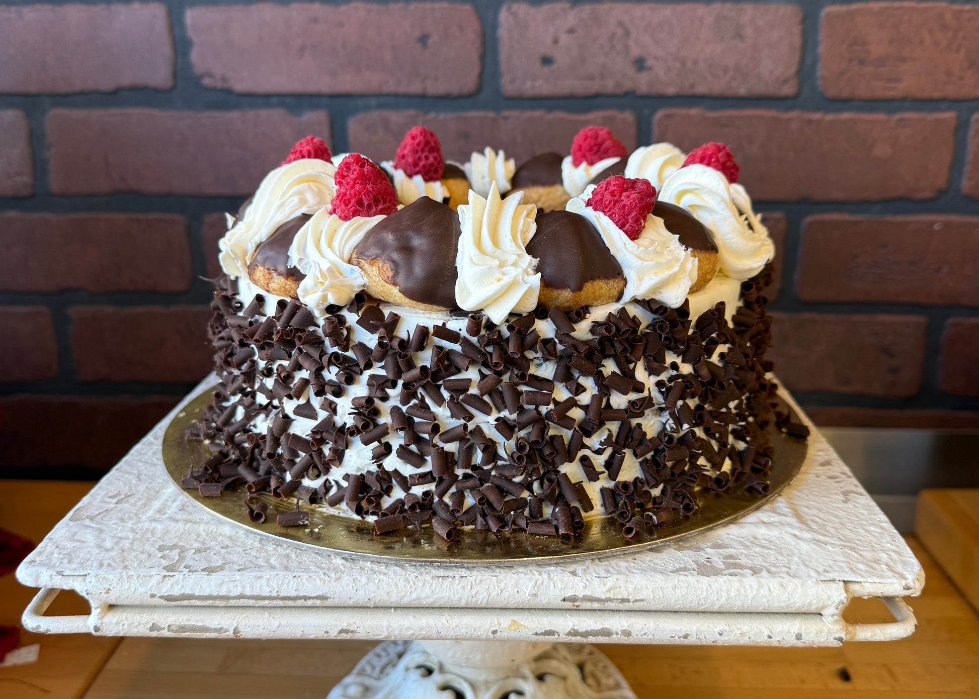 This cake features our handcrafted choux pastry filled with a chocolate whipped custard and fresh raspberries. It has one layer of chocolate sponge and is finished with chocolate shavings, cream puffs, and fresh raspberries. Sold frozen.